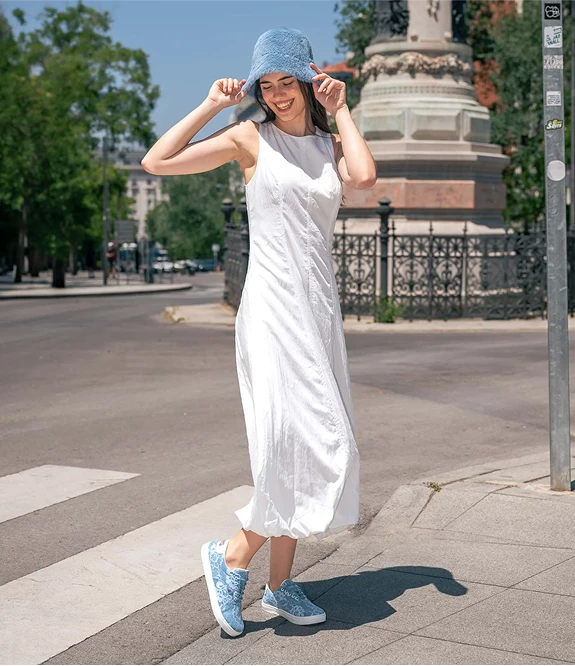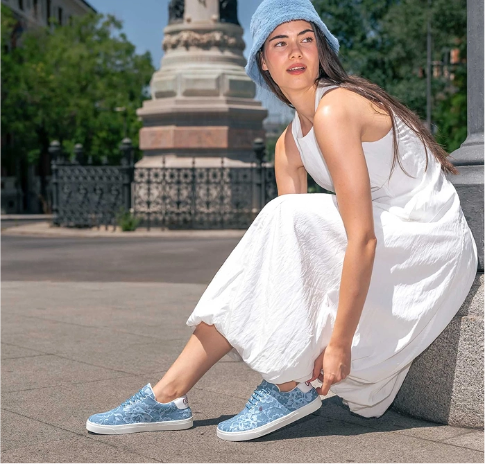 El encanto del denim se encuentra con la delicadeza de la flor magnolia en esta zapatilla tipo inglesa, que reinterpreta un clásico con un toque femenino y lleno de personalidad. Confeccionada en tejido denim de alta calidad, su estampado floral aporta frescura y un aire primaveral que la hace perfecta para looks relajados pero cuidados.