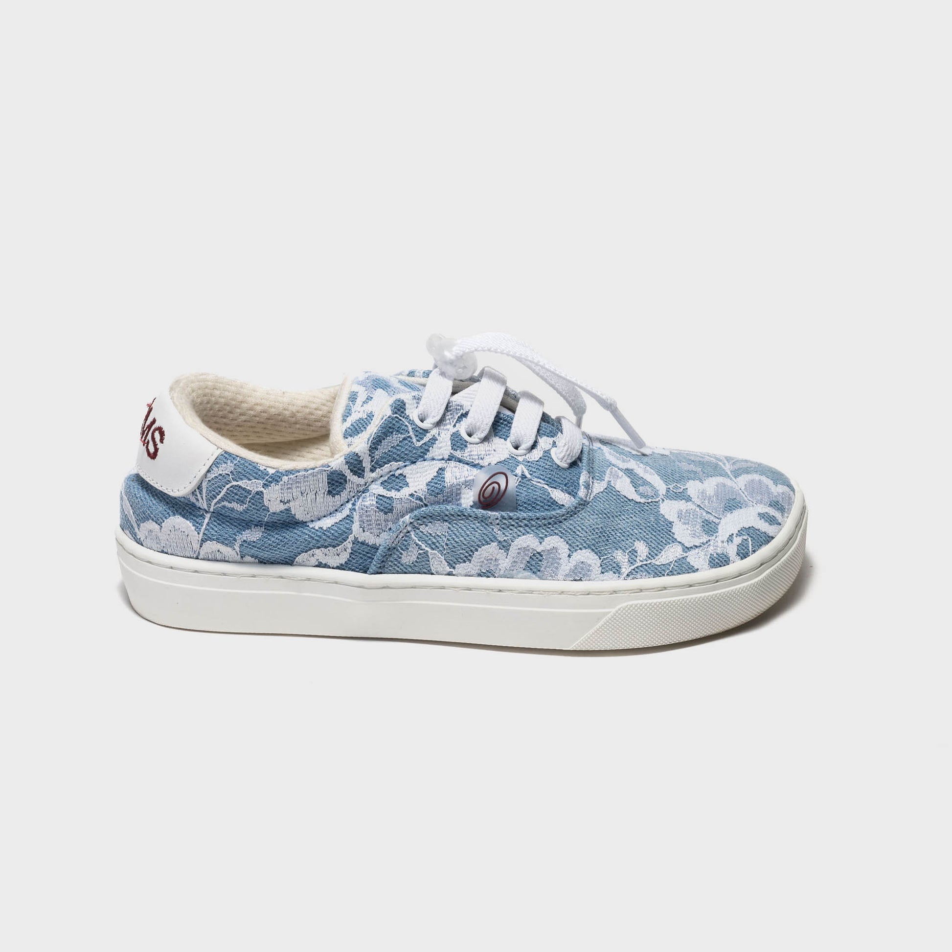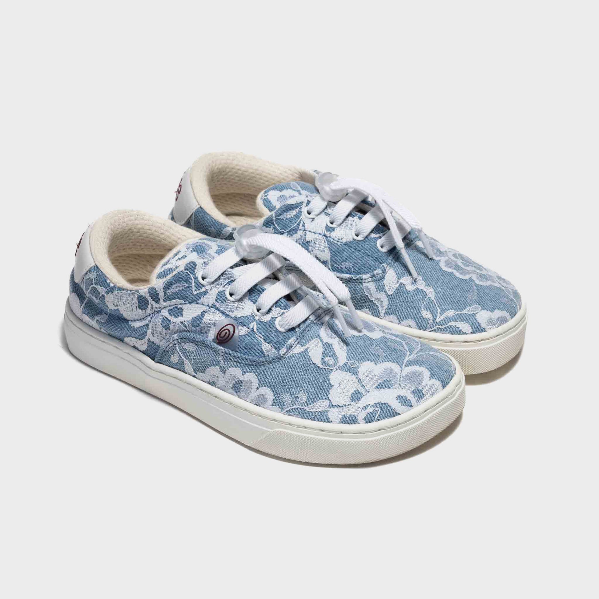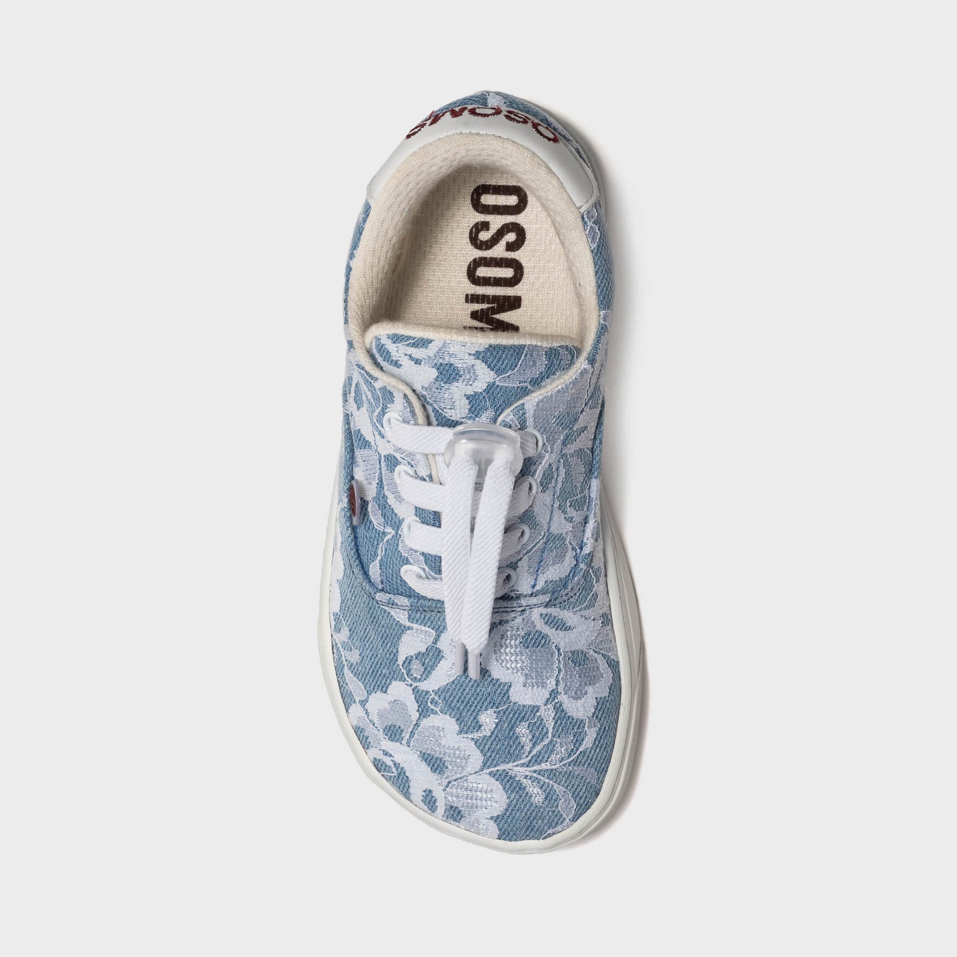 Zapatilla inglesa barefoot en denim con flores magnolia.