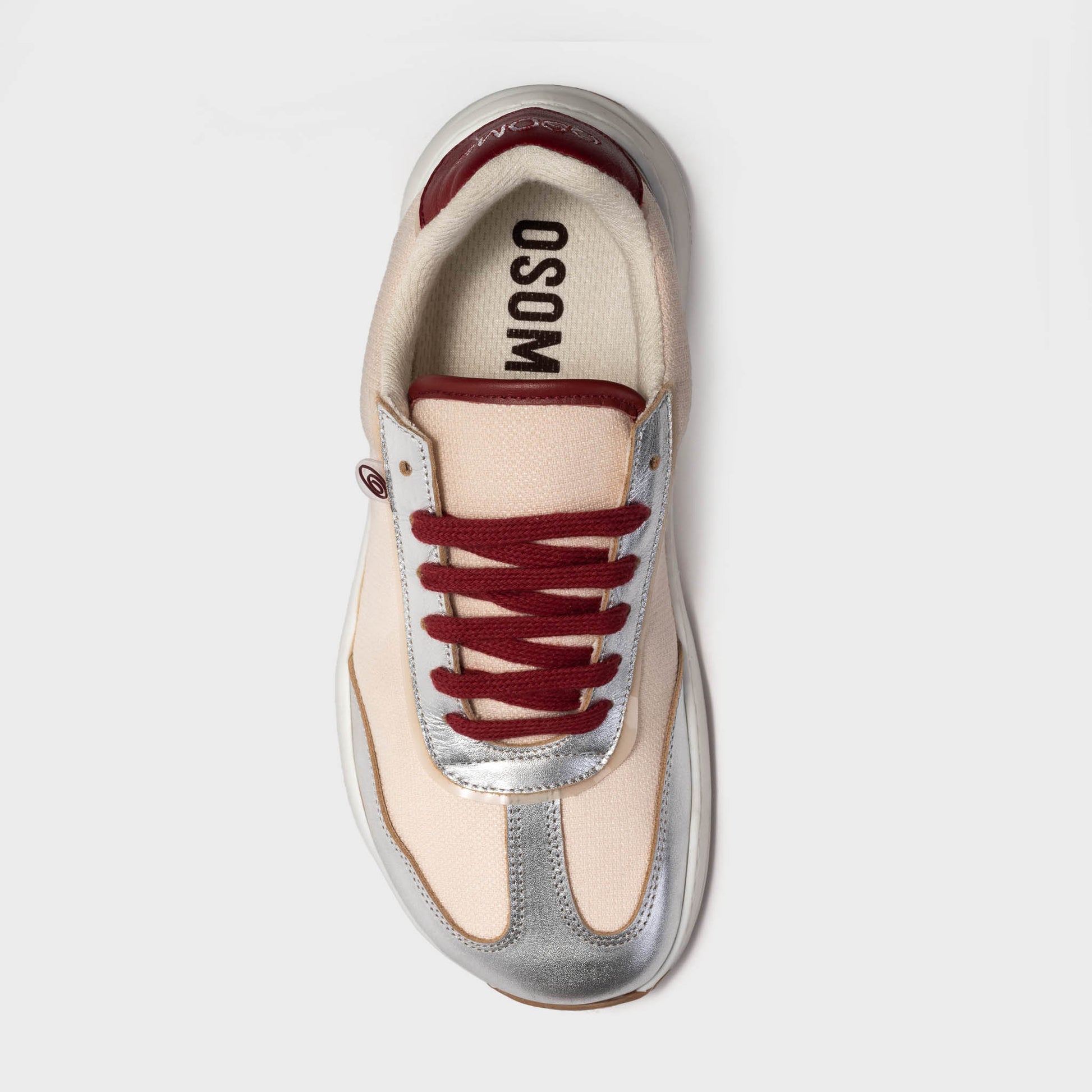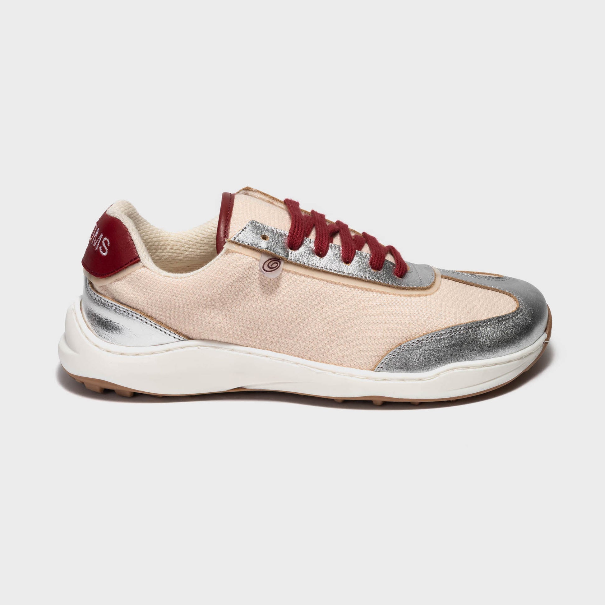Zapatilla deportiva barefoot con tejido texturizado crema, piel plata y detalles burdeos