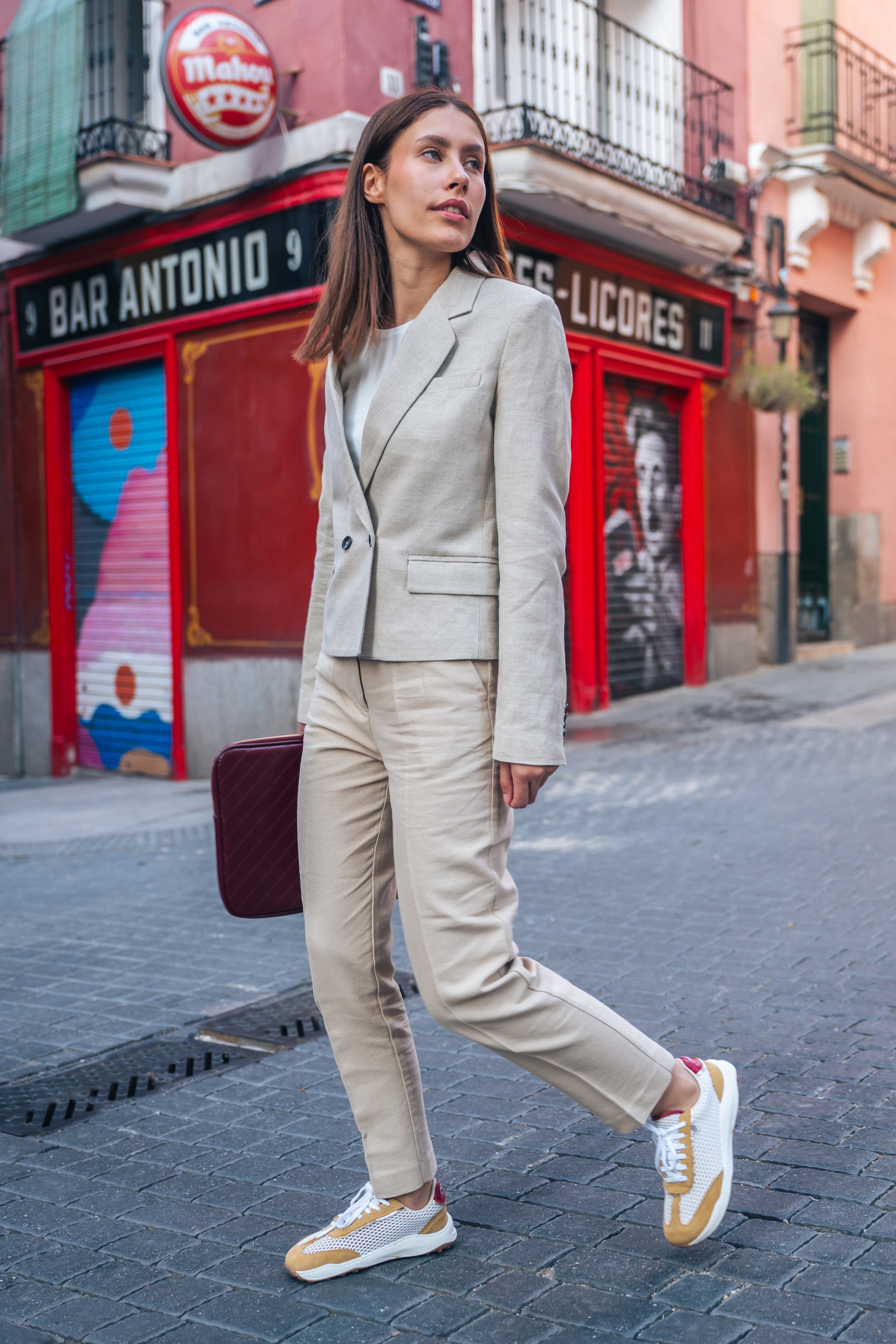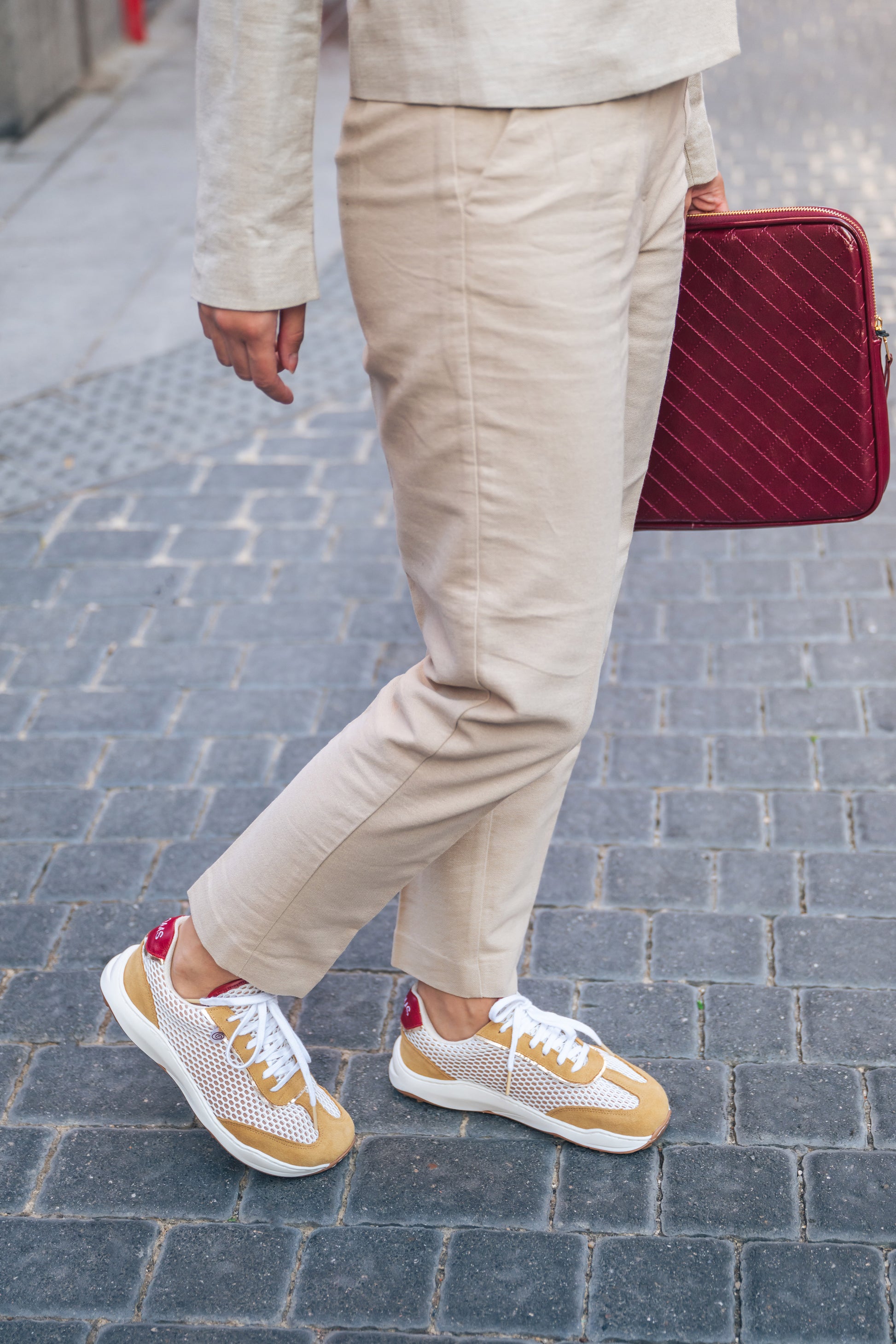 Diseño ligero y elegante con acabados artesanales. Esta zapatilla combina un tejido de rejilla blanca de gran transpirabilidad con un fondo beig sutil que aporta profundidad y estilo. Los refuerzos en serraje color miel añaden estructura, suavidad y un contraste cálido que eleva el diseño.